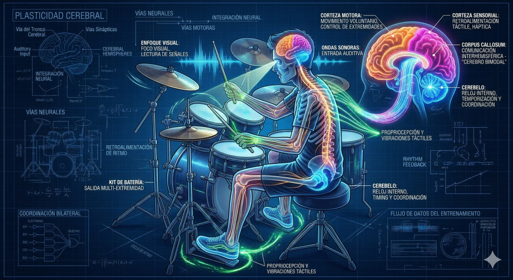 En términos sencillos, este tipo de procesamiento bimodal es la capacidad de nuestra «computadora biológica» para procesar e integrar simultáneamente dos flujos de información provenientes de canales o sentidos diferentes, como la ejecución motora y el estímulo sonoro, permitiendo que ambos trabajen en equipo de forma ultra eficiente. Esta capacidad de integración multimodal ha sido documentada en distintos contextos, incluyendo el bilingüismo bimodal (Emmorey & McCullough, 2009), y se traslada directamente a la práctica percusiva. Tocar la batería actúa como un entrenamiento que facilita este procesamiento, alineándose con metodologías de vanguardia como la de ASC.